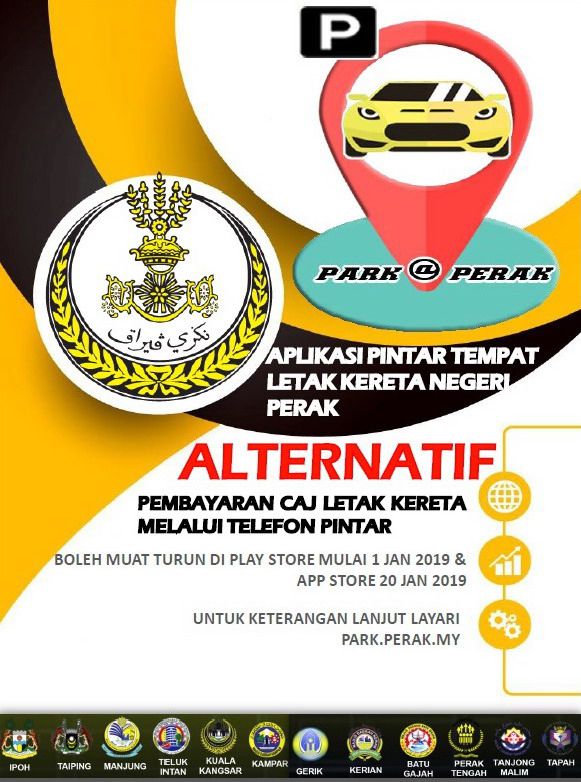 Aplikasi pintar PARK@PERAK boleh dimuat turun di Play Store, App Store dan yang terkini di Huawei Gallery.