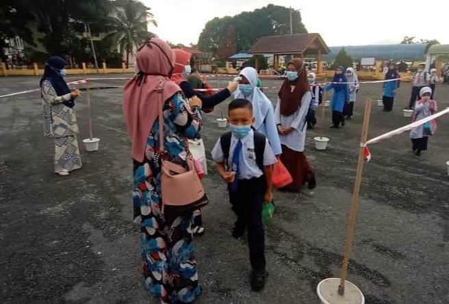 "Bacaan suhu akan diambil di pintu masuk dan slip catatan suhu diberikan kepada murid seterusnya guru kelas akan merekodkan di dalam buku catatan.