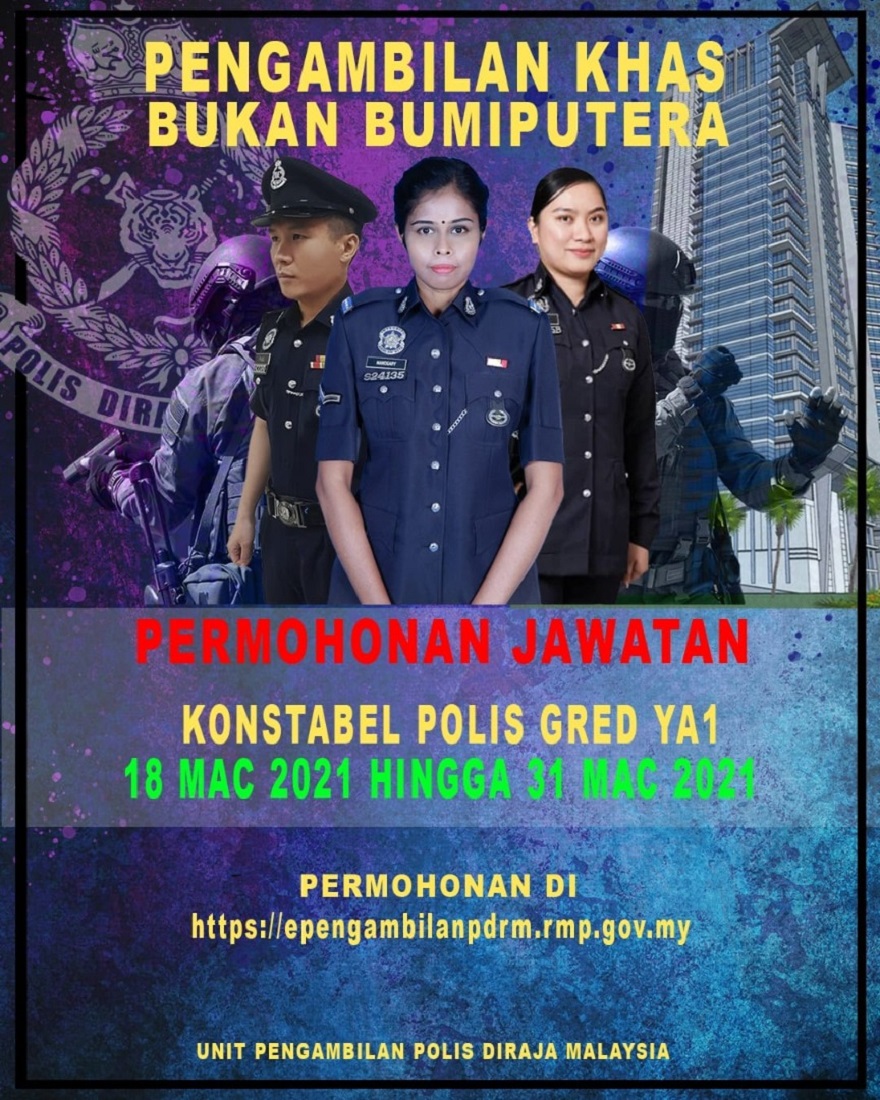 Iklan bagi perjawatan tersebut telah pun dibuka bagi permohonan jawatan konstabel Gred YA1 lelaki dan perempuan menerusi Pengambilan Khas Bukan Bumiputera mulai 18 Mac ini perlu dibuat secara dalam talian menerusi laman web e-Pengambilan PDRM.