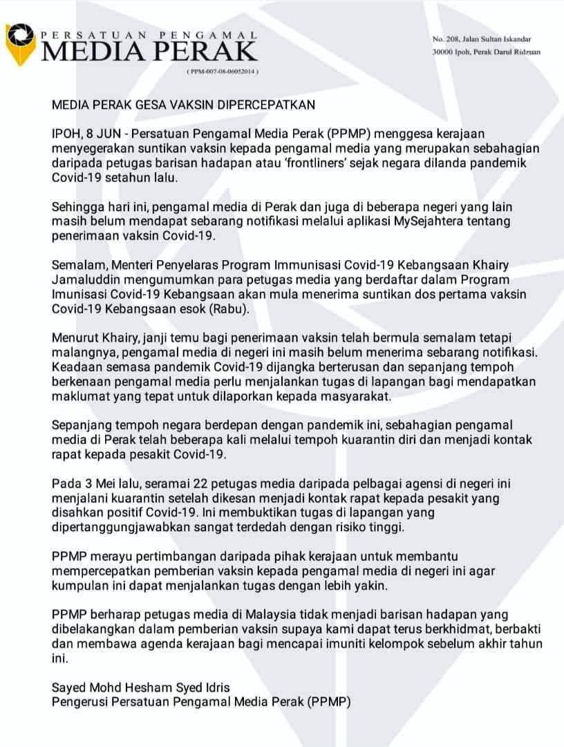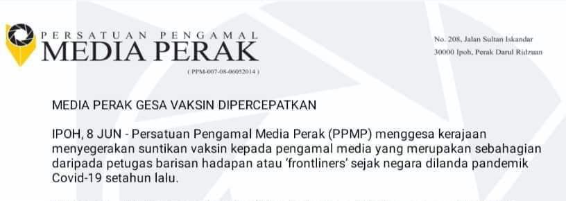Justeru, Persatuan Pengamal Media Perak (PPMP) menggesa kerajaan supaya menyegerakan pemberian vaksin kepada pengamal media di Perak serta beberapa negeri lain agar mereka dapat bertugas dengan lebih yakin dan selamat.