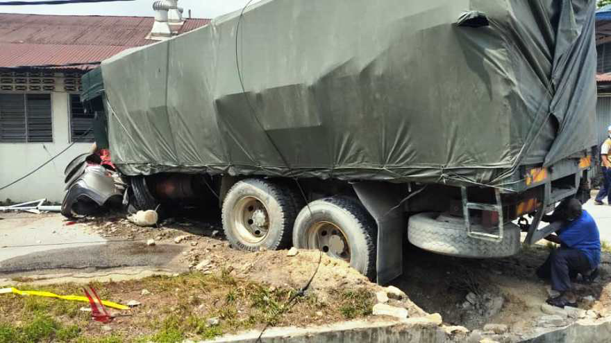 Dalam kejadian pada jam 10.20 pagi itu, lori dari arah Lumut menuju ke Ipoh itu dikatakan hilang kawalan lalu terbabas masuk ke laluan bertentangan sebelum merempuh kereta Proton Persona dipandu mangsa.