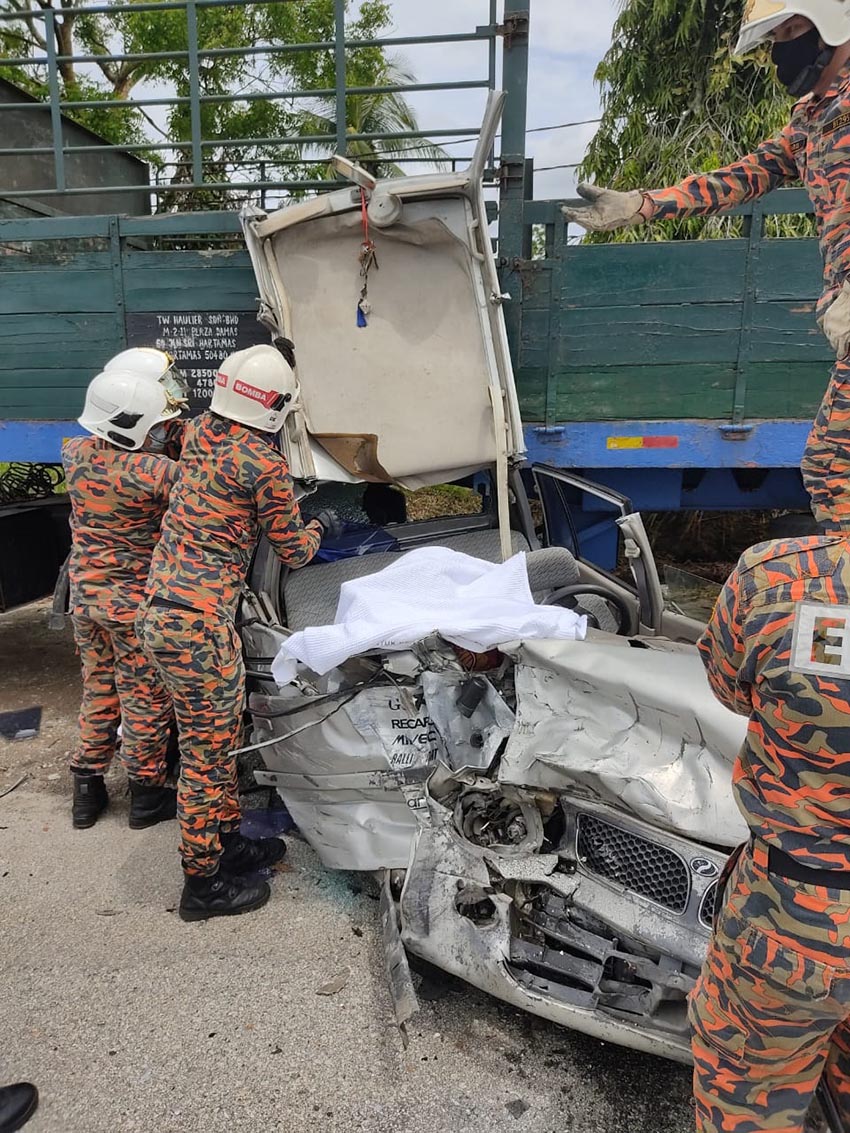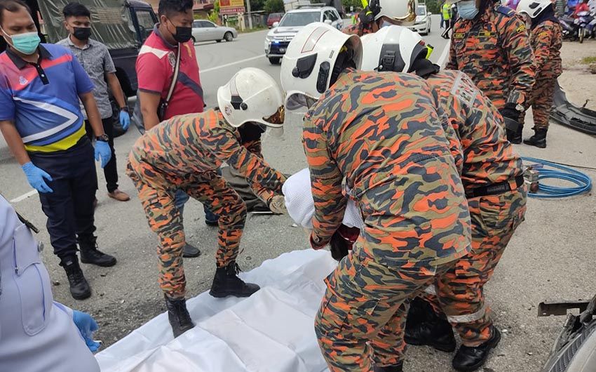 "Kemalangan melibatkan dua buah kenderaan di mana mangsa berusia 35 tahun tersepit di dalam kereta Perodua Kancil dipandunya.