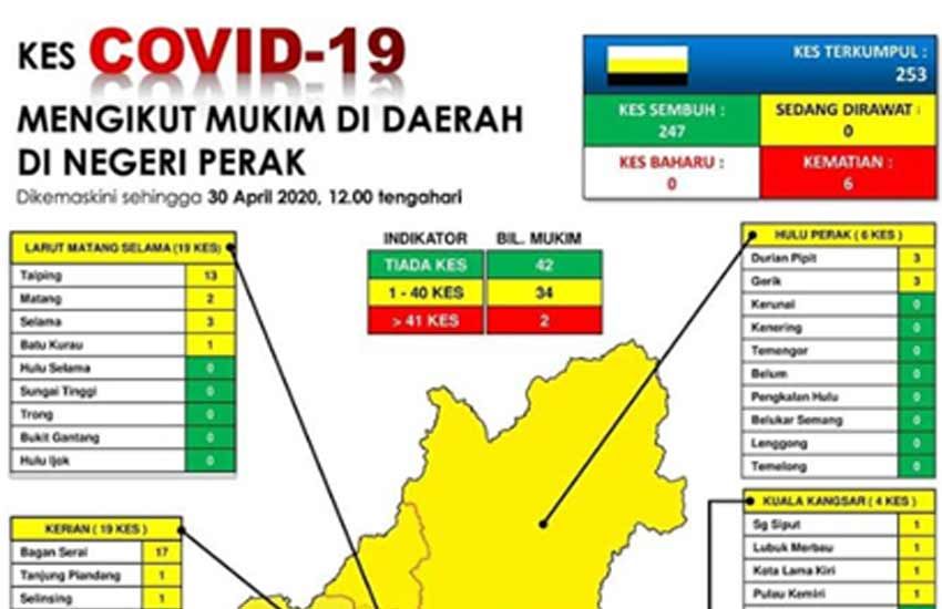 Menerusi data yang dikeluarkan oleh Pusat Kesiapsiagaan dan Tindak Cepat (CPRC) Kebangsaan, dua kes positif yang dikesan sebelum ini dengan masing-masing satu kes di Kinta dan Manjung telah pulih selepas merekodkan 253 kes jangkitan Covid-19 keseluruhan.