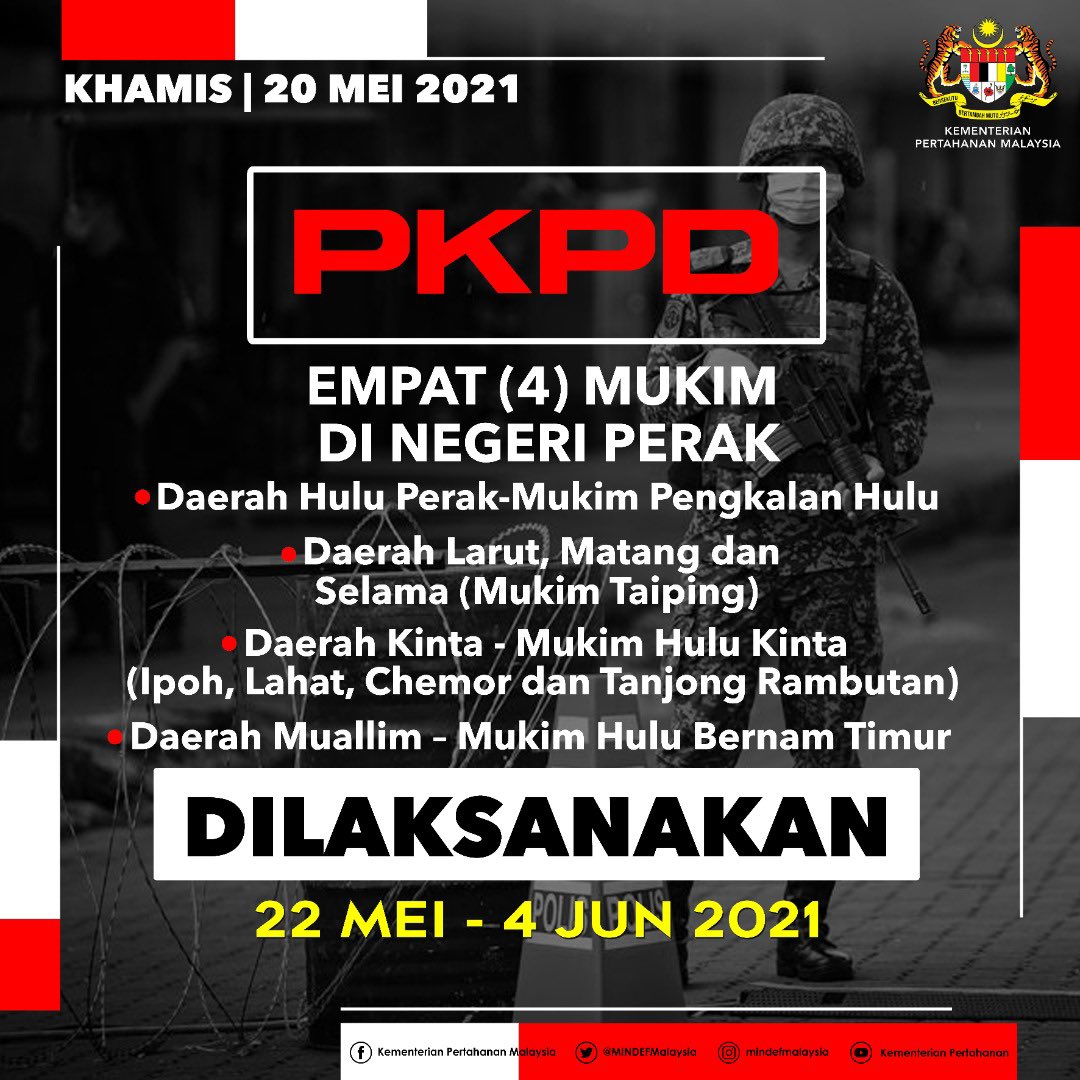 IPOH - Perintah Kawalan Pergerakan Diperketatkan (PKPD) akan dilaksanakan di empat mukim di Perak bermula Sabtu ini sehingga 14 Jun.