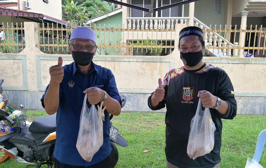IPOH - Hujan renyai tidak menghalang Ahli Majlis Majlis Bandaraya Ipoh (MBI) Zon 21 (Sungai Rapat) Abu Bakar Hussian bersama petugas lain mengagihkan 480 ekor ayam segar percuma secara pandu lalu berhampiran Padang Futsal Taman Maju Rapat Ipoh pagi ini.