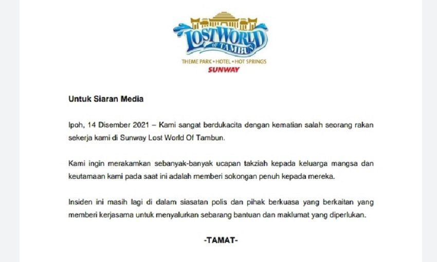IPOH - Susulan kes kematian seorang juruteknik di taman tema terkemuka di sini, Lost World of Tambun (LWOT) merakamkan ucapan takziah.
