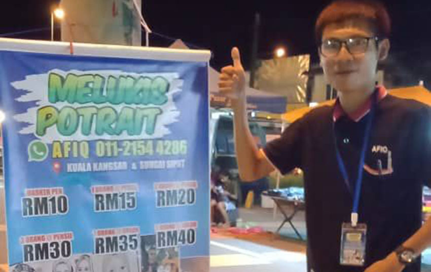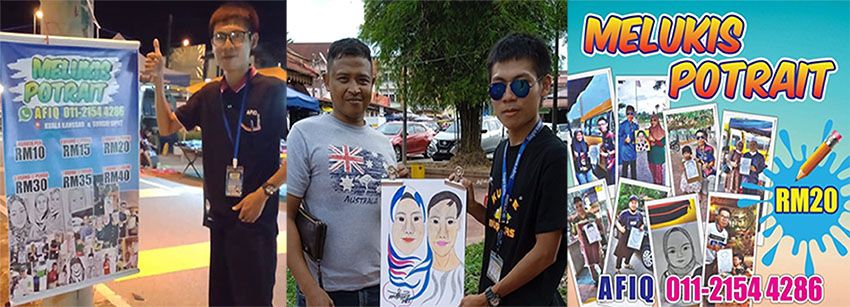 Lee Chee Hung, 24, pemuda berbangsa Cina yang dilebih dikenali sebagai ‘Afiq’ dikalangan penduduk setempat, sedikitpun tidak kekok untuk mempromosikan dirinya menerusi risalah iklan khidmat melukis potret di sekitar kawasan Lembah Kuala Kangsar.