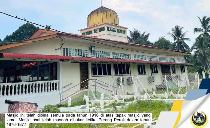 Masjid tersebut dibina semula pada tahun 1916 di tapak masjid lama yang musnah dibakar ketika berlakunya Perang Perak pada tahun 1876 hingga 1877.