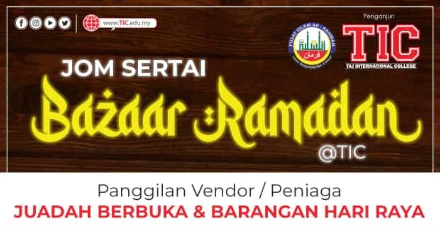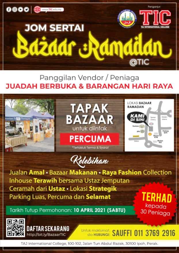 IPOH – Kolej Antarabangsa TAJ (TIC) berbesar hati menyediakan 30 tapak bazar Ramadan secara percuma kepada peniaga-peniaga yang ingin menambah pendapatan sempena bulan puasa ini.
