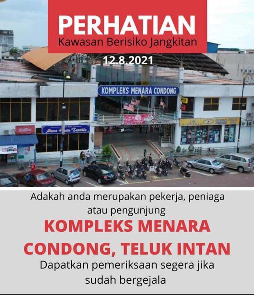 Dalam perkembangan berkaitan, sesiapa yang telah berkunjung ke Kompleks Menara Condong diminta mengemaskini maklumat kepada pihak Pejabat Kesihatan Daerah (PKD) Hilir Perak.