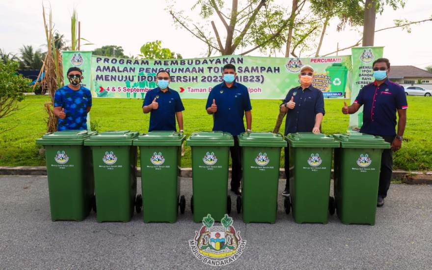 IPOH - Majlis Bandaraya Ipoh (MBI) mengagihkan 300 tong sampah beroda berkapasiti 120 liter dari rumah ke rumah melalui Program Membudayakan Amalan Penggunaan Tong Sampah di Taman Buntong Ria, hari ini.