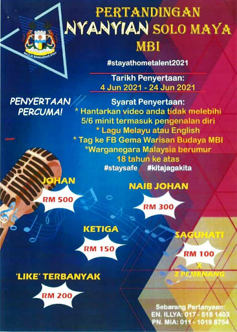 IPOH - Majlis Bandaraya Ipoh (MBI) menganjurkan pertandingan nyanyian solo secara maya (#stayathometalent2021) bermula hari ini sehingga 24 Jun depan.
