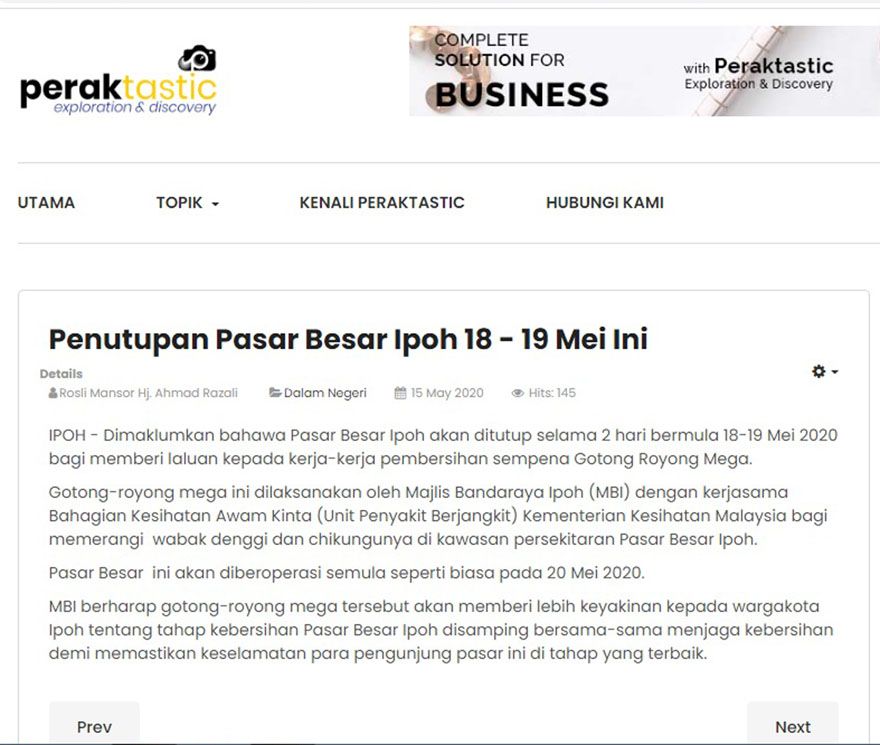 “Perniagaan saya sedikit terjejas akibat insiden itu namun tindakan pantas MBI mengadakan gotong royong mega pada tahun lalu telah membantu mengatasi masalah wabak tersebut,” katanya ketika ditemui pagi ini.