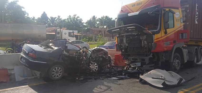 Kemalangan berlaku setelah kereta Proton Perdana yang dipandu mangsa bertembung secara berhadapan dengan treler tersebut.