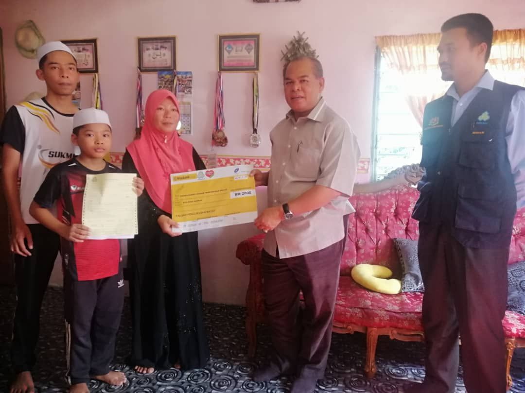Dalam kunjungan itu, Perkeso menyerahkan replika cek Faedah Pengurusan Mayat (FPM) berjumlah RM 2,000 kepada isteri arwah, Wahida Napiah, 41, yang disampaikan Ahli Dewan Undangan Negeri (ADUN) Alor Pongsu, Datuk Sham Mat Sahat.