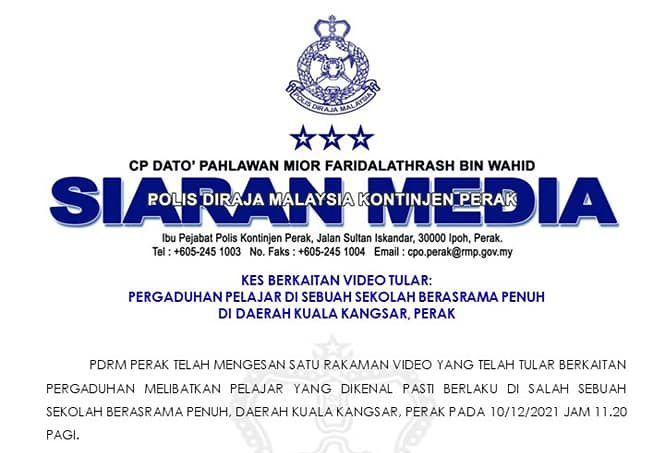 IPOH - Polis Perak telah mengesan satu rakaman video yang telah tular berkaitan pergaduhan melibatkan pelajar yang dikenal pasti berlaku di sebuah sekolah berasrama penuh, Daerah Kuala Kangsar, Perak pada jam 11.20 pagi, 10 Disember 2021.