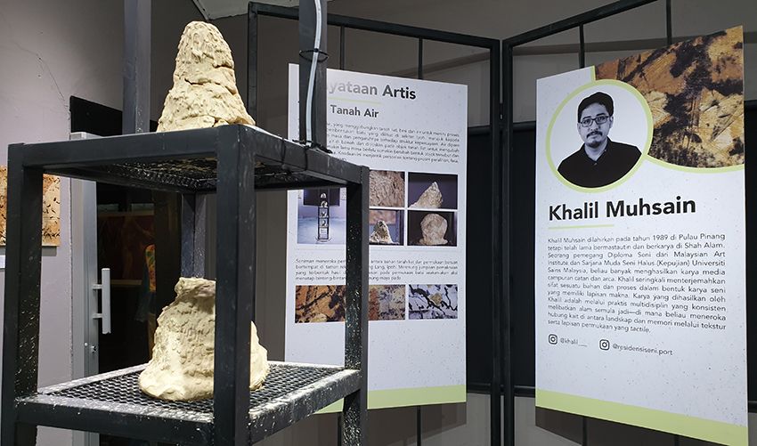 Tiang Tanah Air, karya Khalil Muhsain menggabungkan tanah liat, besi dan air. Karya ini meniru proses semula jadi pembentukan batu yang merujuk kepada perkembangan masa dan pengaruhnya terhadap struktur kepercayaan.