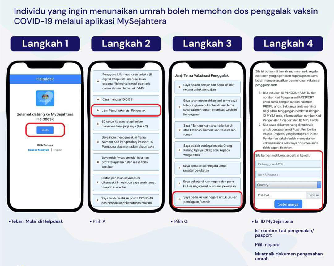 MADINAH - Jemaah yang bakal mengerjakan umrah boleh memohon dos penggalak vaksin Covid-19 menerusi aplikasi MySejahtera.