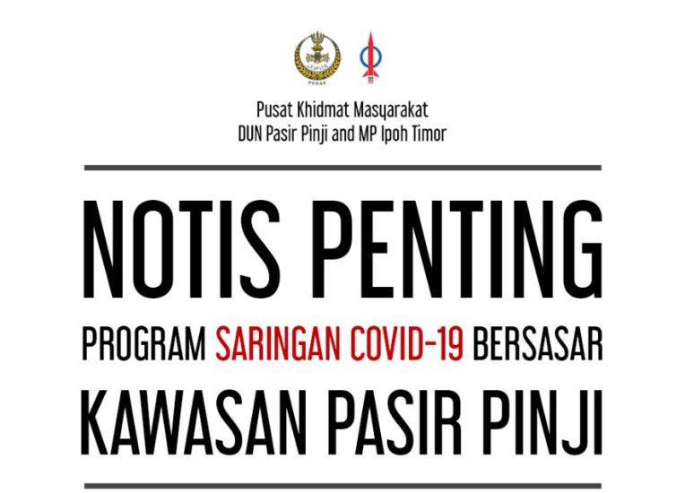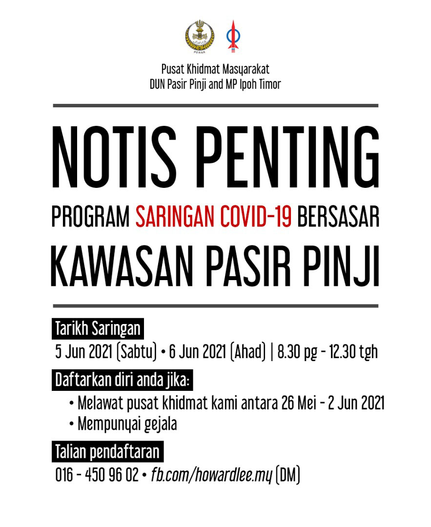 IPOH - Orang ramai yang mengunjungi Pusat Khidmat Dewan Undangan Negeri (Dun) Pasir Pinji antara 26 Mei hingga 2 Jun lalu serta mempunyai gejala, diminta untuk hadir ke pusat berkenaan bagi menjalani ujian saringan Covid-19 secara bersasar mulai esok dan Ahad ini.