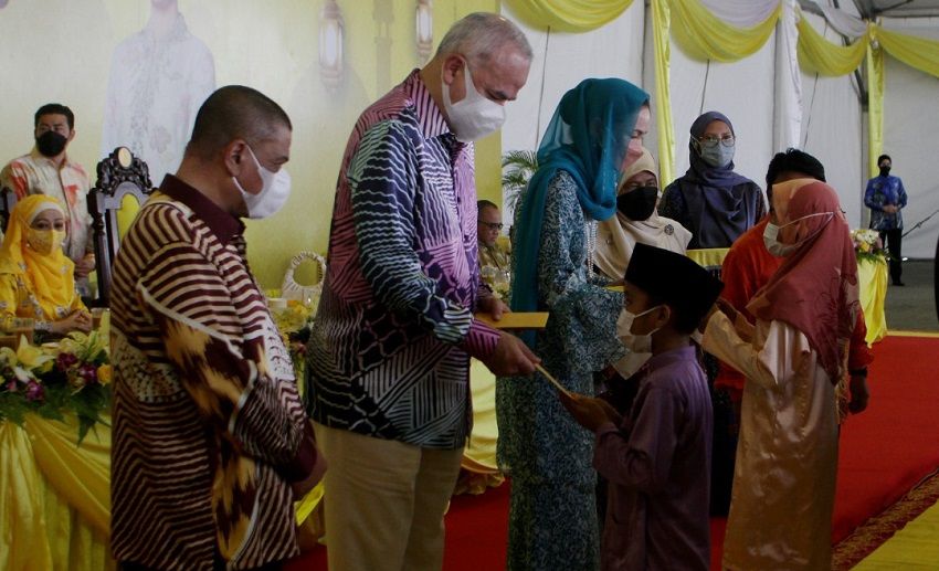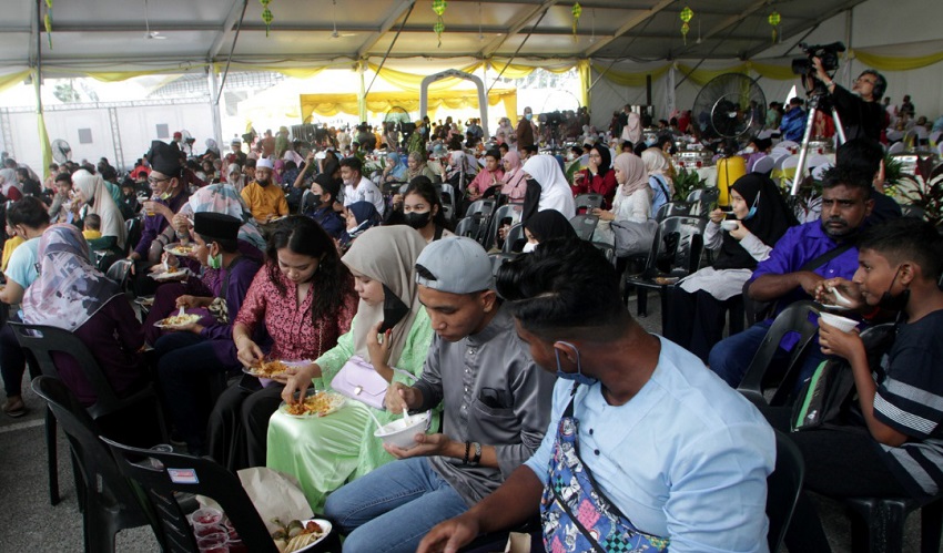 Majlis berkenaan yang menyajikan pelbagai juadah hari raya antaranya lemang, rendang, sate, nasi impit dan kuih-muih.