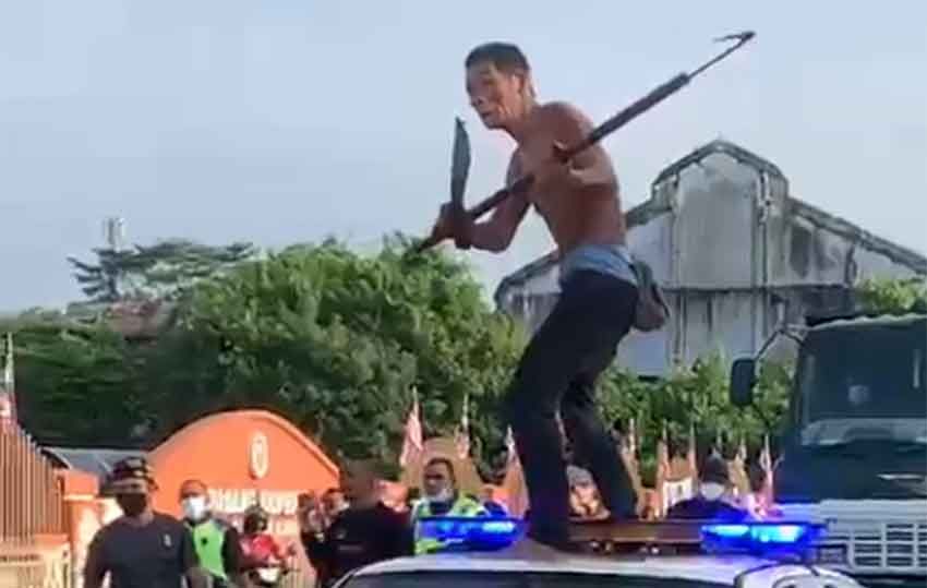 IPOH – Satu rakaman video menunjukkan aksi seorang lelaki menghayunkan sebilah sabit panjang mengamuk sambil berdiri di atas sebuah kereta peronda polis tular di laman sosial sejak pagi tadi.