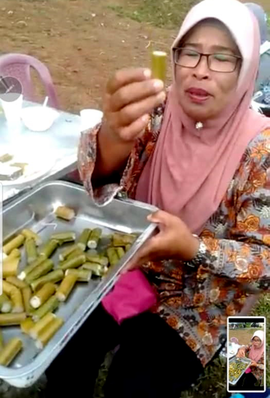 “Pada mulanya sukar untuk memasukkan daun pisang ke dalam buluh yang kecil sepanjang dua kaki lebih. Tetapi kesukaran itu dapat diatasi dengan mudah berkat kesabaran dan kini ianya yang hanya beberapa minit sahaja untuk menyiapkan sebatang lemang”, katanya sewaktu ditemubual di rumahnya di Kampung Pulau Ador berhampiran Felda Lasah baru-baru ini.