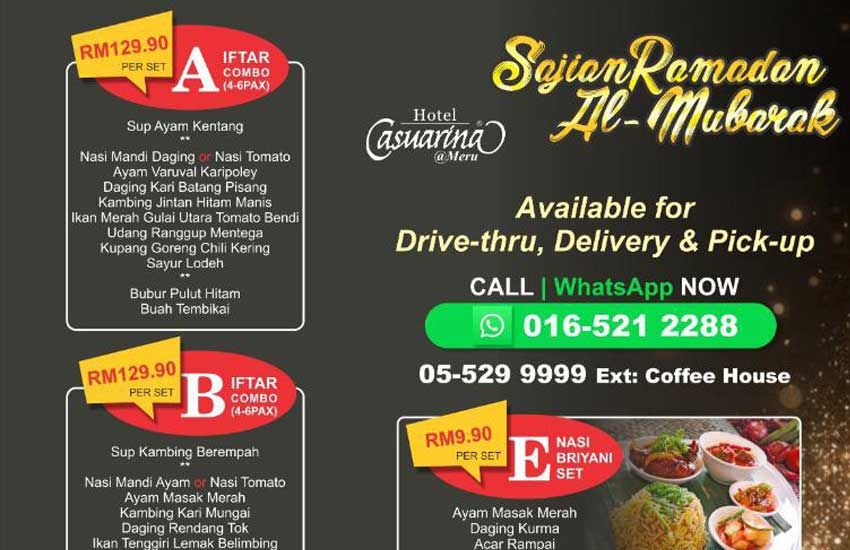 Ini kerana orang ramai masih berpeluang untuk menikmati hidangan daripada air tangan cef Hotel Casuarina@Meru sepanjang Ramadan menerusi pembelian secara pandu lalu, penghantaran atau bungkus.