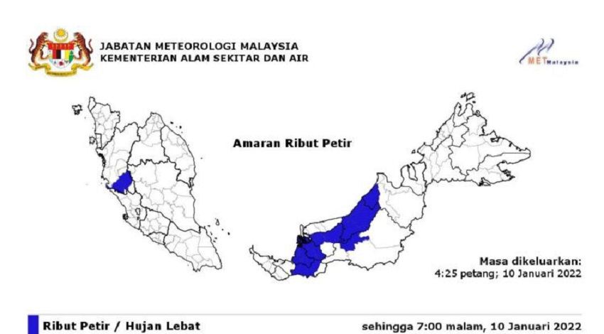 Menurut jabatan itu, amaran sama juga berlaku di Sarawak melibatkan Sri Aman (Sri Aman), Betong, Sarikei, Sibu (Sibu dan Selangau), Mukah (Tanjung Manis), Kapit (Kapit), Bintulu dan Miri (Subis).
