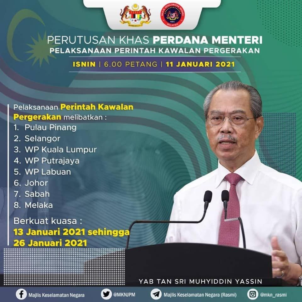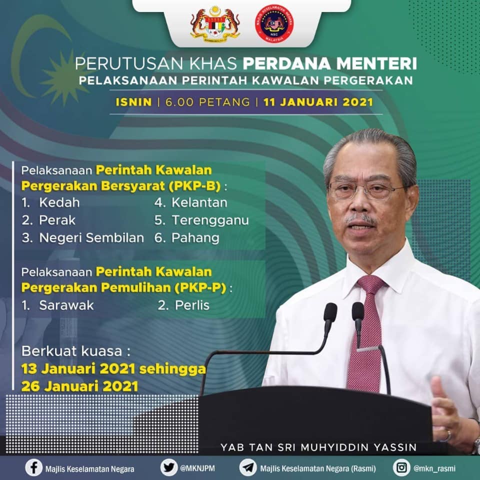 Perdana Menteri Tan Sri Muhyiddin Yassin mengumumkan perintah itu membabitkan tiga peringkat pelaksanaan iaitu PKP ke atas enam negeri iaitu Pulau Pinang, Selangor, Wilayah Persekutuan (Kuala Lumpur, Putrajaya dan Labuan), Melaka, Johor dan Sabah.