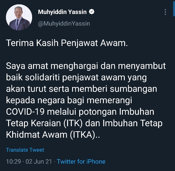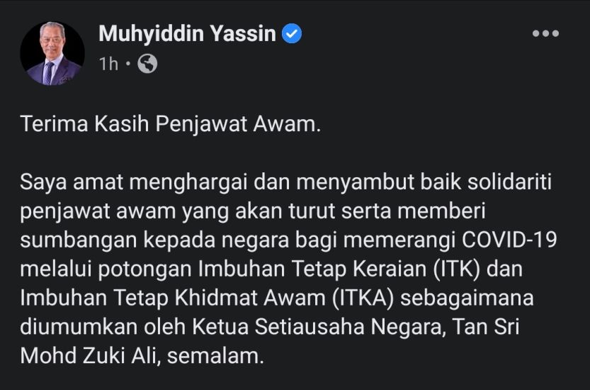 Beliau juga amat menghargai dan menyambut baik solidariti penjawat awam yang turut serta memberi sumbangan kepada negara bagi memerangi Covid-19 melalui potongan Imbuhan Tetap Keraian (ITK) dan Imbuhan Tetap Khidmat Awam (ITKA) sebagaimana diumumkan oleh Ketua Setiausaha Negara, Tan Sri Mohd Zuki Ali, semalam.