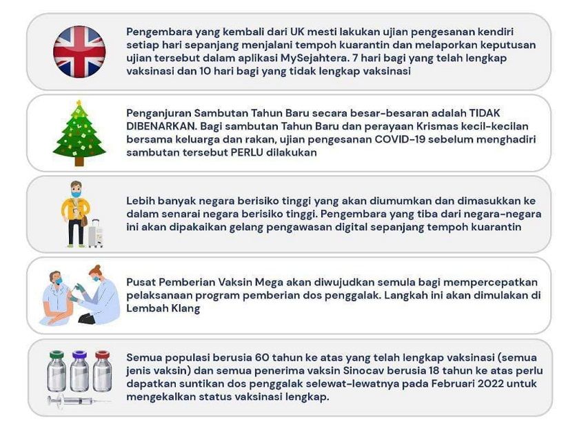 "Bagi langkah tambahan membabitkan pengembara dari UK, mereka mesti melakukan ujian pengesanan kendiri bagi tempoh tujuh hari untuk yang lengkap divaksin dan 10 hari bagi mereka yang tidak lengkap divaksin.