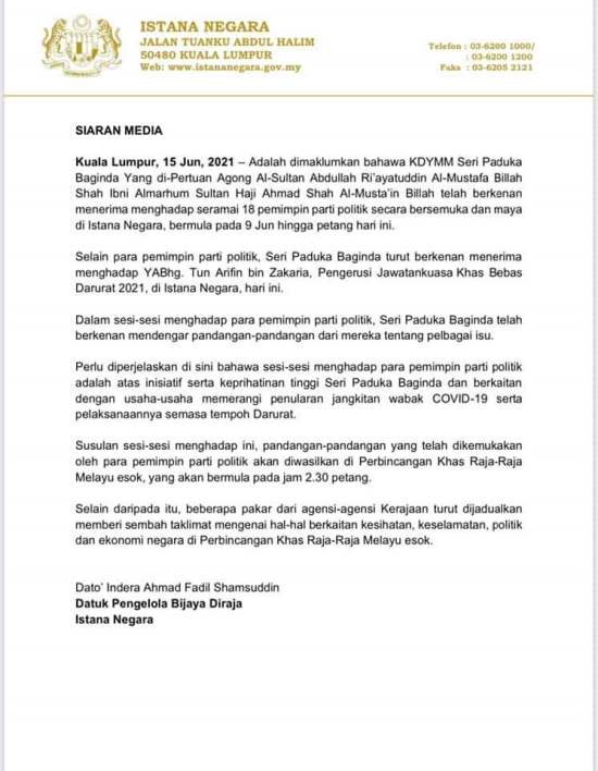KUALA LUMPUR - Bermula 9 Jun sehingga petang tadi, Yang di-Pertuan Agong, Al-Sultan Abdullah Ri'ayatuddin Al-Mustafa Billah Shah telah berkenan menerima menghadap 18 pemimpin parti politik secara bersemuka dan maya di Istana Negara bagi mendengar pandangan mereka mengenai pelbagai isu terutamanya berkaitan pandemik Covid-19.