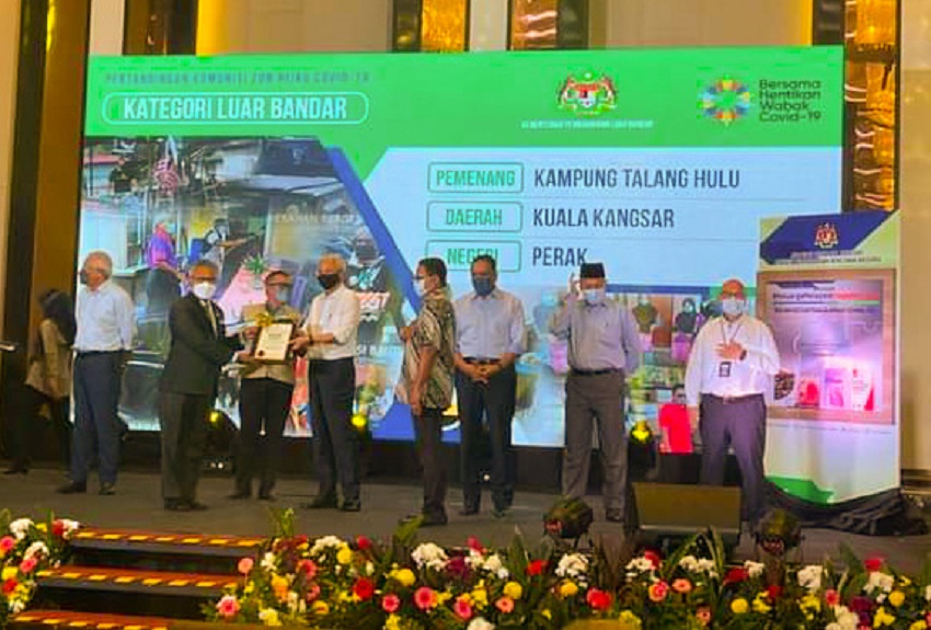 PUTRAJAYA - Kampung Talang Hulu dari Daerah Kuala Kangsar dinobatkan sebagai Johan dalam Pertandingan Komuniti Zon Hijau COVID-19 Kategori Luar Bandar (Kampung Tradisional) bagi negeri Perak, baru-baru ini.