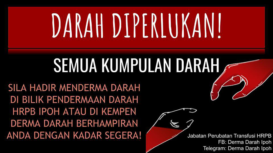 IPOH- Hospital Raja Perempuan Bainun (HRPB) memohon kerjasama orang ramai untuk menderma darah. Difahamkan bekalan darah di HRPB tidak mencukupi bagi menampung keperluan rawatan pesakit.