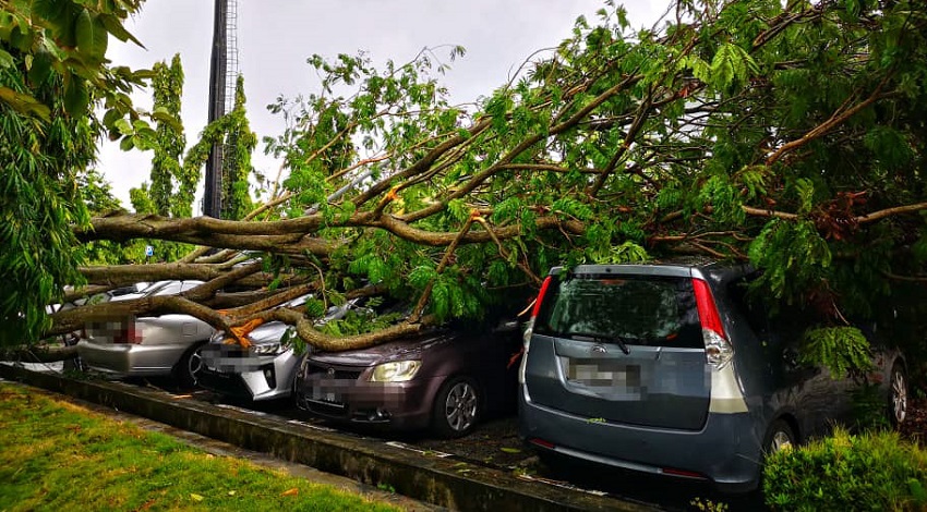 IPOH - Hujan lebat beserta angin kuat petang tadi menyebabkan sebatang pokok besar tumbang menghempap lima buah kenderaan yang diletakkan di kawasan parkir sebuah restoran makanan segera di Gunung Rapat.