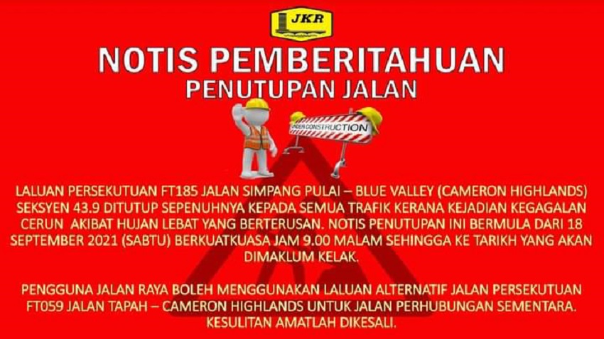 Read more: Laluan Simpang Pulai - Cameron Highlands ditutup kerana tanah runtuh