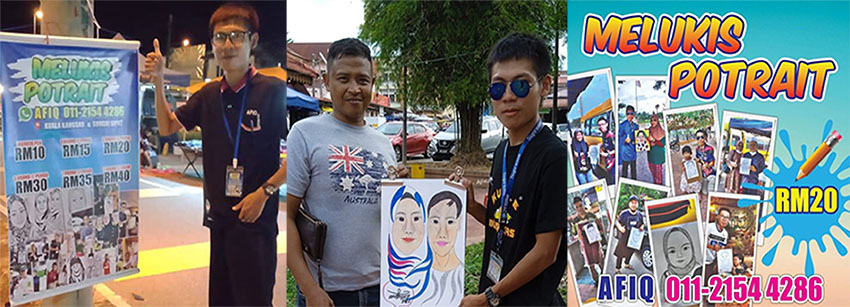 Lee Chee Hung, 24, pemuda berbangsa Cina yang dilebih dikenali sebagai ‘Afiq’ dikalangan penduduk setempat, sedikitpun tidak kekok untuk mempromosikan dirinya menerusi risalah iklan khidmat melukis potret di sekitar kawasan Lembah Kuala Kangsar.