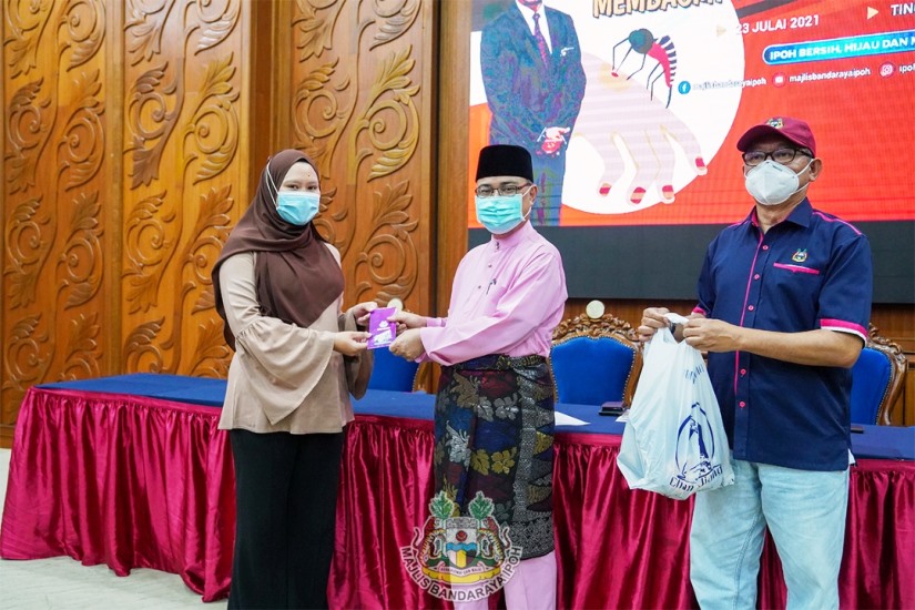 Datuk Bandar Ipoh, Datuk Rumaizi Baharin @ Md Daud menyampaikan kit tersebut kepada Pengerusi Kawasan Rukun Tetangga (KRT) dan Program Komunikasi Untuk Perubahan Tingkahlaku (Combi), Noraini Saad dalam satu majlis ringkas di Bilik Gerakan MBI, petang tadi.