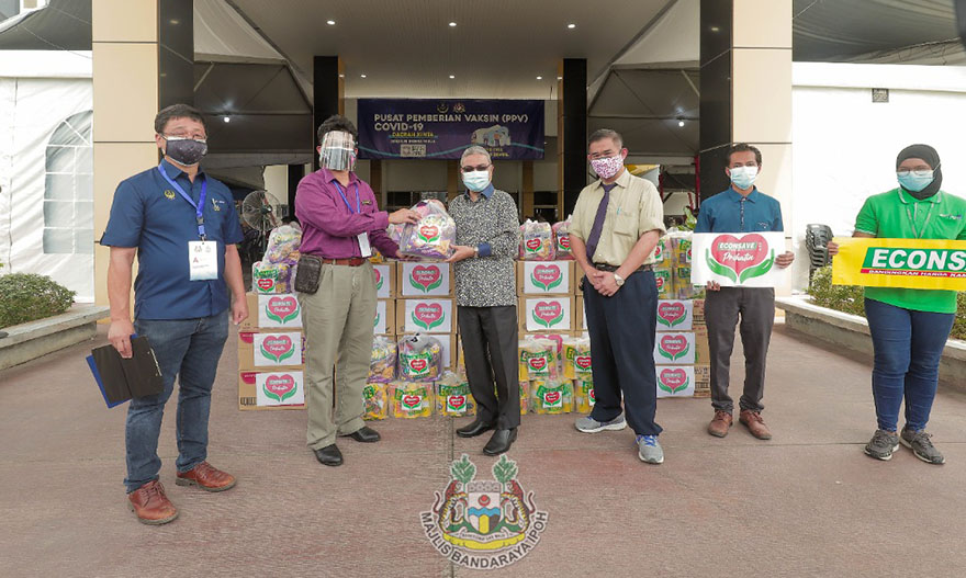 IPOH- Pusat Pemberian Vaksin (PPV) di Stadium Indera Mulia, dipilih sebagai PPV pertama menerima sumbangan makanan menerusi Program MBI Prihatin.